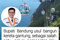 Bandung, Jabar,CyberLiputan6.com- Bupati Bandung, Dadang Supriatna, mengusulkan pembangunan proyek kereta gantung sebagai salah satu solusi untuk mengatasi kemacetan lalu lintas, khususnya di jalur-jalur wisata…