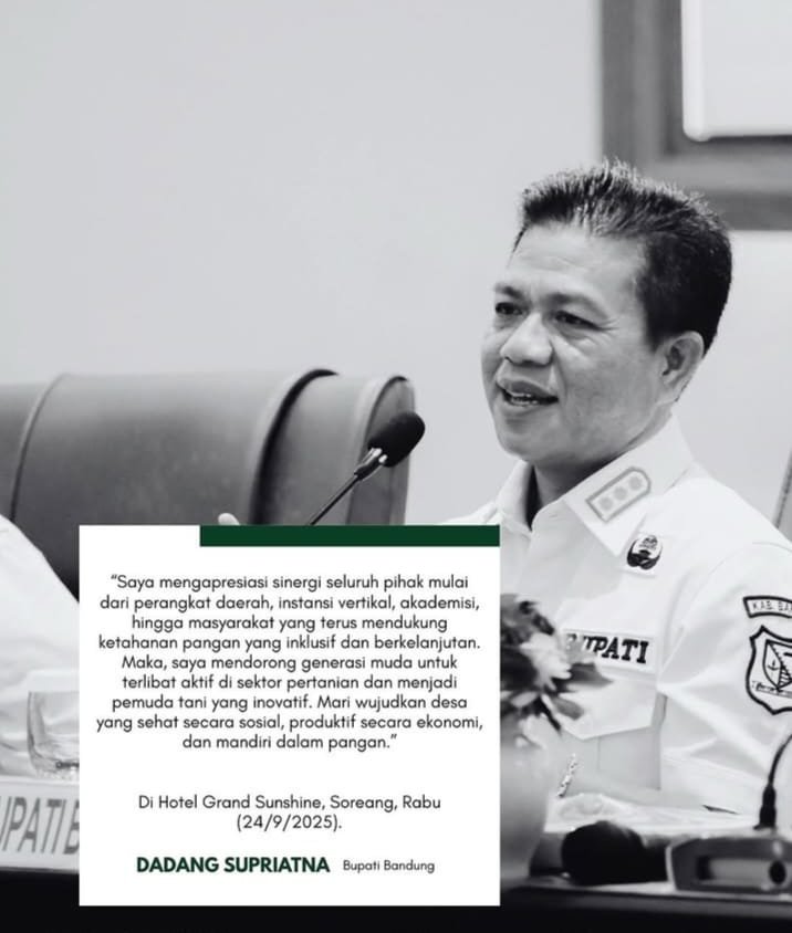 Bupati Bandung, Dadang Supriatna, menghadiri kegiatan sosialisasi Peta Ketahanan dan Kerentanan Pangan (Food Security and Vulnerability Atlas/FSVA) Kabupaten Bandung Tahun 2025, Rabu (24/9/2025). Acara ini menjadi salah satu agenda strategis daerah dalam memperkuat ketahanan pangan sekaligus mengidentifikasi titik-titik kerentanan yang perlu mendapatkan perhatian serius.