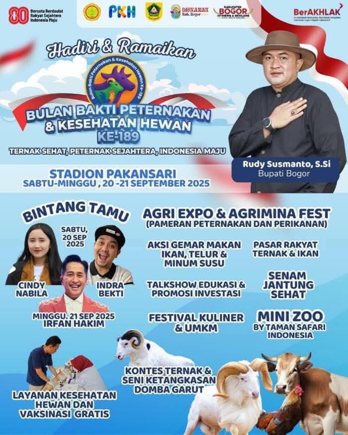 Stadion Pakansari, Kabupaten Bogor, menjadi pusat perhatian ribuan masyarakat pada Sabtu–Minggu (20–21 September 2025) dalam gelaran Bulan Bakti Peternakan dan Kesehatan Hewan ke-189. Mengusung moto “Ternak Sehat, Peternak Sejahtera, Indonesia Maju”, perayaan ini bukan hanya menghadirkan edukasi dan promosi investasi, tetapi juga pesta rakyat penuh hiburan dan tradisi.